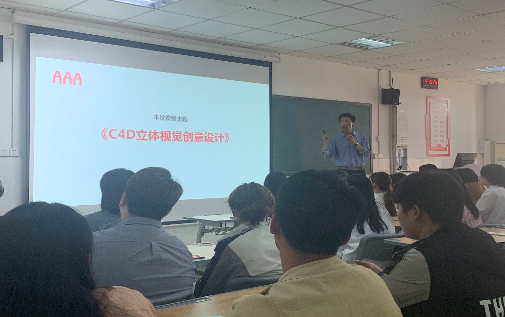企业贾老师针对市场需求及岗位要求去剖析C4D的就业前景,视觉设计行业工具的使用情况及未来岗前培训的周学时计划。学生在听讲的过程中也纷纷提出疑问,如视传专业中UI设计师、视觉设计师的具体岗位要求,目前视觉设计领域优秀创意的创作过程等,贾老师都一一做出解答,企业的姜楠老师及张伟丽老师也及时做出补充说明。