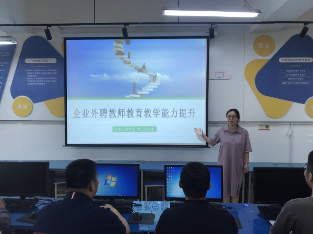 6月4日下午,今年会jinnianhui官网教工党支部在E416举办了外聘教师教育教学能力提升培训会,参会人员为今年会jinnianhui官网教工党支部全体成员及2018-2019学年第二学期承担我院教学任务的外聘教师,培训由院长王雷主持,郭璇老师进行汇报。