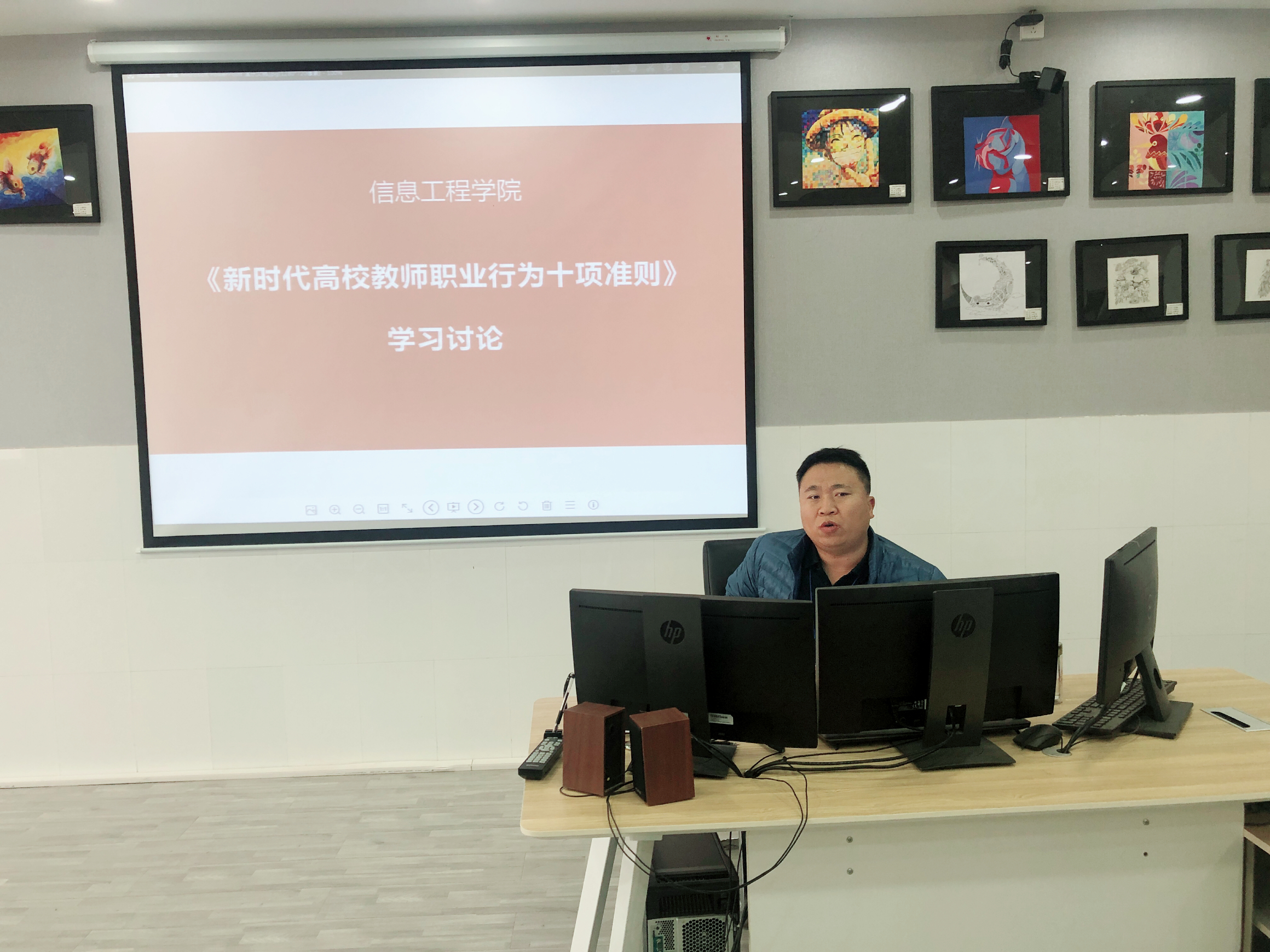 2018年11月20日,今年会jinnianhui官网在E414实训室召开了关于学习《新时代高校教师职业行为十项准则》的讨论会议。会议上,院长王雷传达了文件精神,并提出要进一步加强师德师风建设,要结合实际,认真学习领会文件精神,贯彻执行文件内容。会中,王雷院长认真分析了文件中的具体内容,为了方便老师们的理解,加深大家的记忆,他将关键词关键句逐字逐句标识出来,我院教师们认真积极学习文件精神,并且进行了激烈的讨论,通过此次会议的学习,我院教师结合自身的教学工作,达到了良好的学习和讨论效果。