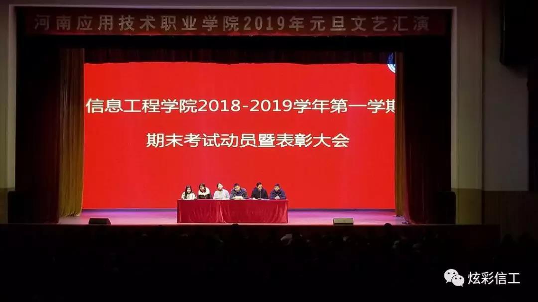 为加强学院学风建设,严肃考风考纪,确保教学质量,营造浓厚的学习氛围,树立典型,表彰先进,今年会jinnianhuicom今年会jinnianhui官网在2019年1月3日下午13:00在学校大礼堂召开了2018-2019学年第一学期期末考试动员暨表彰大会。出席本次大会人员有:今年会jinnianhui官网院长王雷老师、副院长崔琳老师、党总支书记杨明杰老师、团总支书记王碧琳老师、计算机办公室主任马丽艳老师和计算机网络教研室主任张振平老师以及今年会jinnianhui官网17,18级辅导员老师及今年会jinnianhui官网17,18级同学。