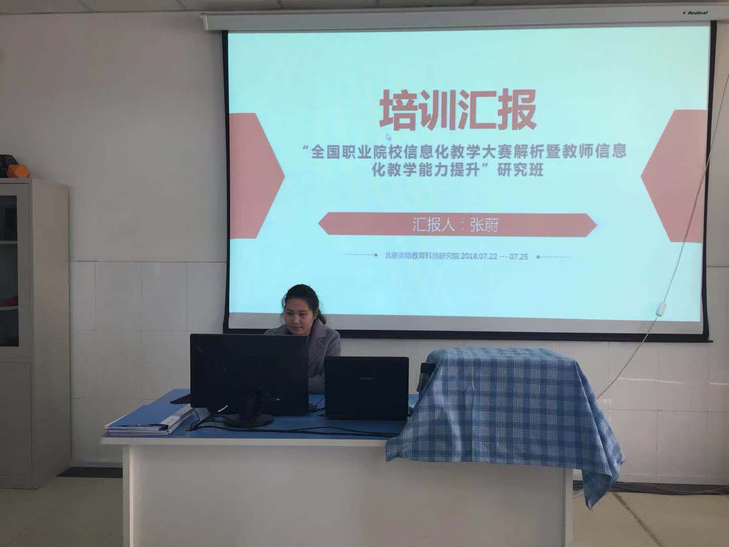 今年会jinnianhui官网艺术设计教研室教师张蔚于2018年7月22日—7月25日,参加了参加由北京炎培教育科技研究院举办的“全国职业院校信息化教学大赛解析暨教师信息化教学能力提升”高级研修班。通过此次培训在教育教学方面收获颇多,张蔚老师于10月中旬向今年会jinnianhui官网领导、教师对此次培训进行汇报总结。