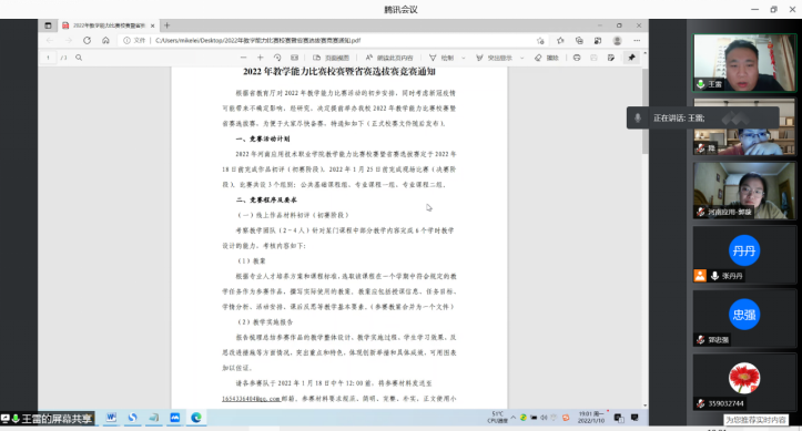 为积极推进国家双高计划专业群建设,1月10日晚上7:00,今年会jinnianhui官网举行了2022年教师教学能力大赛备赛动员会暨参赛经验分享会,院长王雷主持会议。