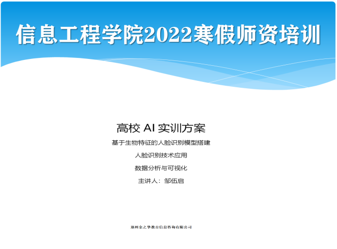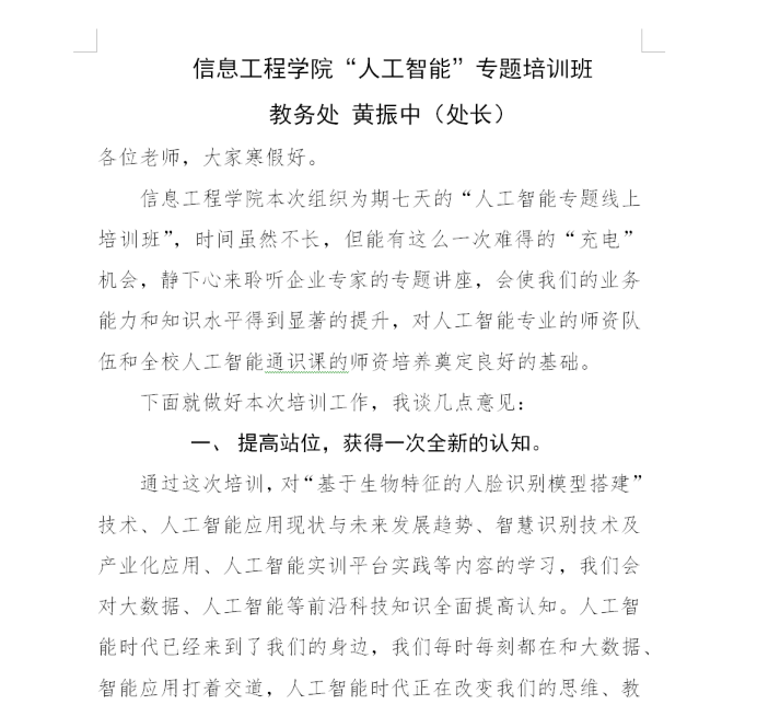 2022年1月14日上午,培训举行开班仪式。此次培训由郑州金之挚教育信息咨询有限公司组织实施。该公司是我院优质的师资能力提升合作单位,同时也是清华大学慕课平台(学堂在线)的企业级软件课程合作伙伴。会议由公司教育总监李勇主持,学校教务处长黄振中教授做开班致辞,他指出:参训教师要提高站位,获得一次全新的认知,要以本次学习为契机,切入到人工智能的专业化领域。要推陈出新,得到一次思想的启迪,让人工智能+课程的理念深入人心,认识到不学习就被淘汰,不更新就被替代,不智能就无未来的紧迫形式。校企联合开展培训,是一次难得的机遇,期待此次线上培训的累累硕果,希望大家都能取得自己本次培训主要面向我校人工智能相关专业的任课教师,目标是提升我校人工智能通识课和专业课教学水平,启迪更多的老师来思考新的人工智能教学模式。培训采用项目贯穿并按照项目的实际开发流程进行,着重训练综合运用新技术进行项目开发的能力,同时还组织教师交流沙龙,深入探讨如何进行创新型专业建设和应用型人才培养。