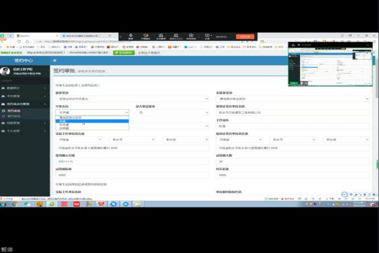 最后,李晨针对今年新启用的网络签约平台对老师们进行培训,包含签约平台的签约流程、审核流程、解约流程以及再签约工作等等。还对各位辅导员反馈的学生在毕业生签约过程中遇到的问题进行了在线答疑。
