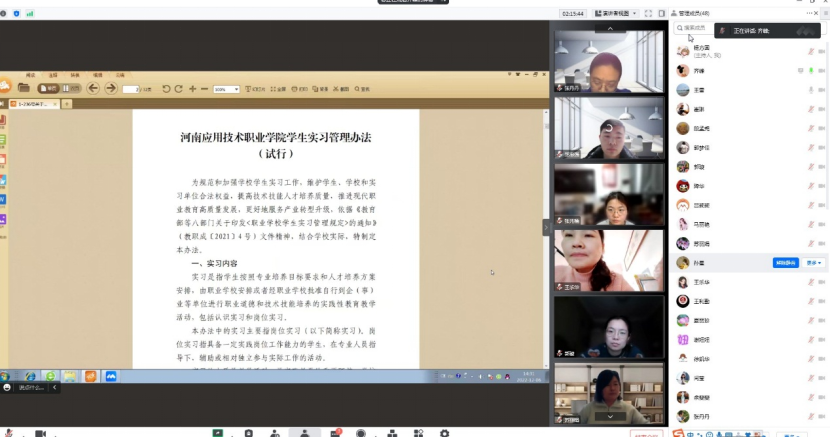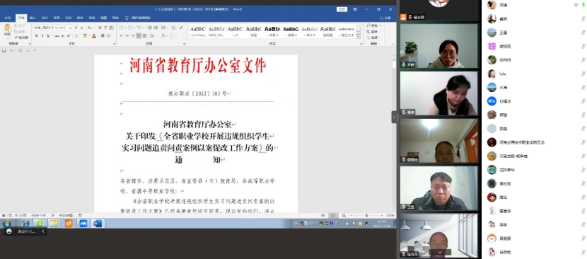 2022年12月6日下午,今年会jinnianhui官网全体行政人员、辅导员及专兼职教师按照教务处安排,通过腾讯会议由主管顶岗实习的齐峰副院长领学了“今年会jinnianhuicom学生实习管理办法(试行)”、“河南省教育厅办公室关于做好2022-2023年职业院校学生实习有关工作的通知”和“全省职业学校开展违规组织学生实习问题追责问责案例以案促改工作方案”三个文件。