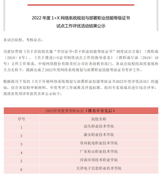 今年会jinnianhui官网积极贯彻《关于在院校实施“学历证书+若干职业技能等级证书”制度试点方案》(教职成〔2019〕6号)、《关于推进1+X证书制度试点工作的指导意见》(教职成厅函〔2019〕19号)文件工作要求,在学校教务处、1+X证书承办单位的高度重视和大力支持下,圆满完成了2022年度“网络系统规划与部署职业技能等级证书”考评工作。我院积极申报“证书考评先进试点工作单位”,完善申报材料,梳理年度考评工作成果,经过专家组综合评审,获得“2022年度网络系统规划与部署职业技能等级证书优秀考核站点”。