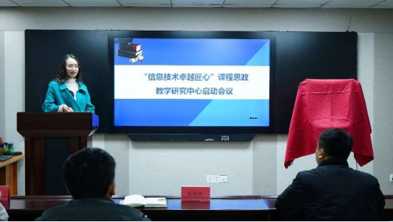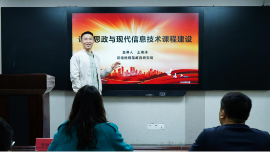 揭牌仪式结束后,梧桐花科技有限公司教育总监王瑞涛受邀做题为《课程思政与现代信息技术课程建设》的专题讲座。与会教研室主任和专业负责人代表分别以“专业思政图谱建设”和“课程思政单元建设”为主题进行经验交流发言。