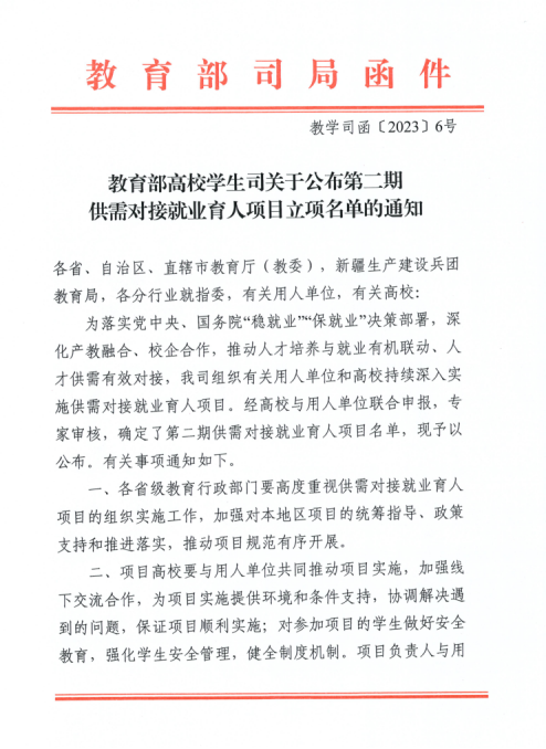 近日,教育部高校学生司发布《关于公布第二期供需对接就业育人项目立项名单的通知》,今年会jinnianhui官网“计算机应用技术专业群”人力资源提升项目获批立项。