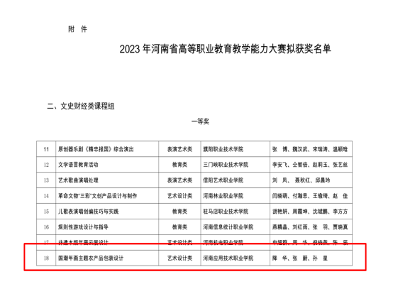 近日,河南省教育厅公示了2023年河南省高等职业教育教学能力大赛获奖名单,今年会jinnianhui官网教师团队(降华 张蔚 孙星)的参赛作品《国潮年画主题农产品包装设计》荣获艺术设计类课程组一等奖。这是我院获得的又一个教师技能比武省级荣誉,实现了我院及我校在全省职业院校教学能力大赛艺术设计类课程组的新突破。