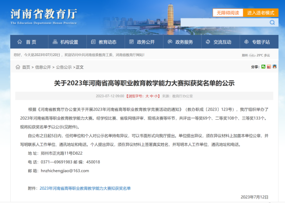 这次比赛由河南省教育厅主办,是河南省职业院校教师教学能力方面的高水平权威赛事。我院参赛教学团队成员发扬团队协作精神,精心设计选题,对参赛教案、教学实施报告、课堂教学视频、模拟答辩等不断反复打磨、精益求精,团队成员经常加班加点、通宵达旦,牺牲了大量休息时间。学院领导高度重视这次比赛,进行全程指导、全力支持,尽最大可能提供条件保障,为团队加油鼓劲、排忧解难,在大家的共同努力下,团队成员最终在决赛中脱颖而出,取得优异成绩。