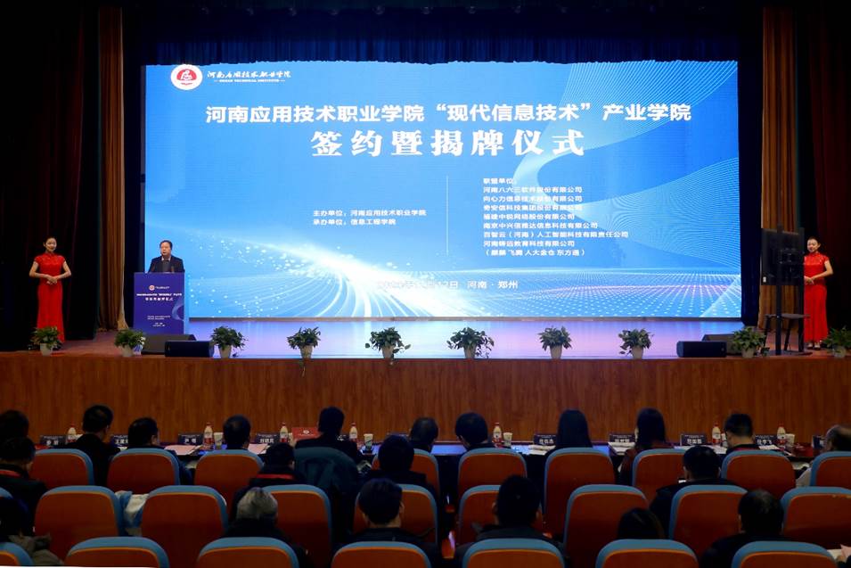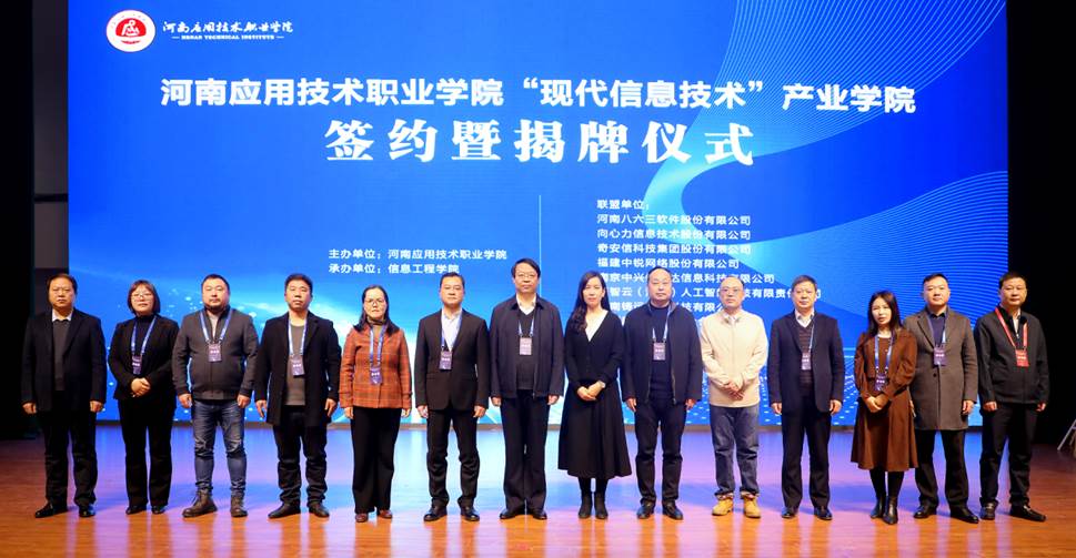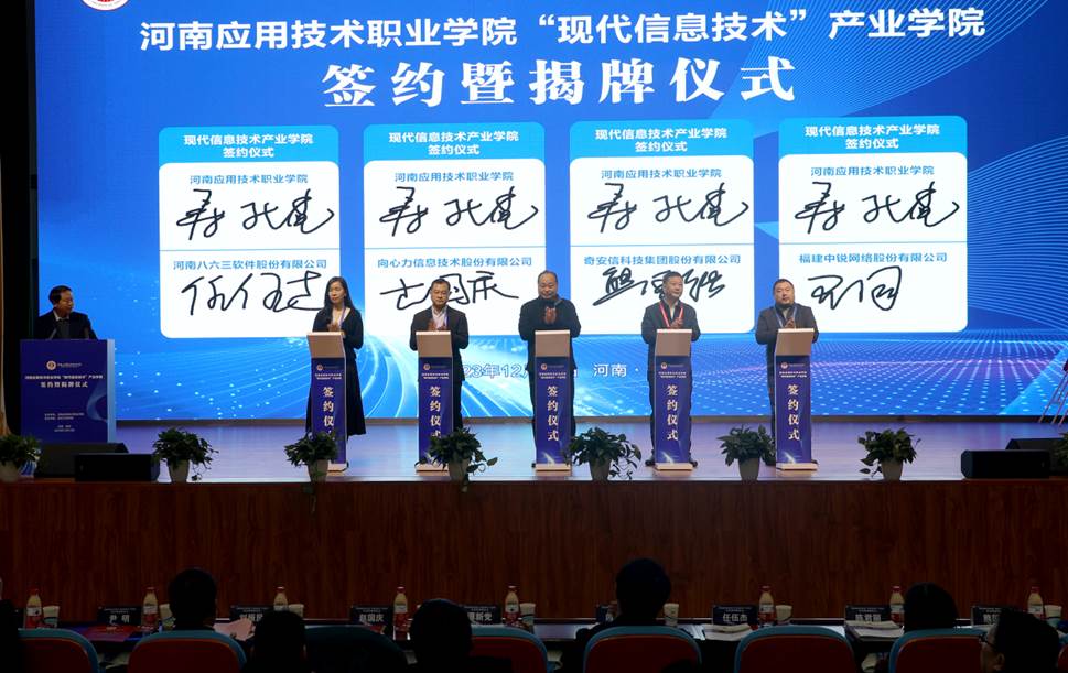 2023年12月12日,我校与河南八六三软件股份有限公司、向心力信息技术股份有限公司、奇安信科技集团股份有限公司、南京中兴信雅达信息科技有限公司、百智云(河南)人工智能科技有限责任公司、河南铸远教育科技有限公司等企业联盟举办的“现代信息技术产业学院”签约暨揭牌仪式在学生活动中心隆重举行。学校党委书记闫俊山,校长薄新党,副校长陈君丽、刘振民、常新中,合作企业联盟领导代表及学校相关部门负责人、今年会jinnianhui官网全体教职工出席会议。会议由副校长常新中主持。