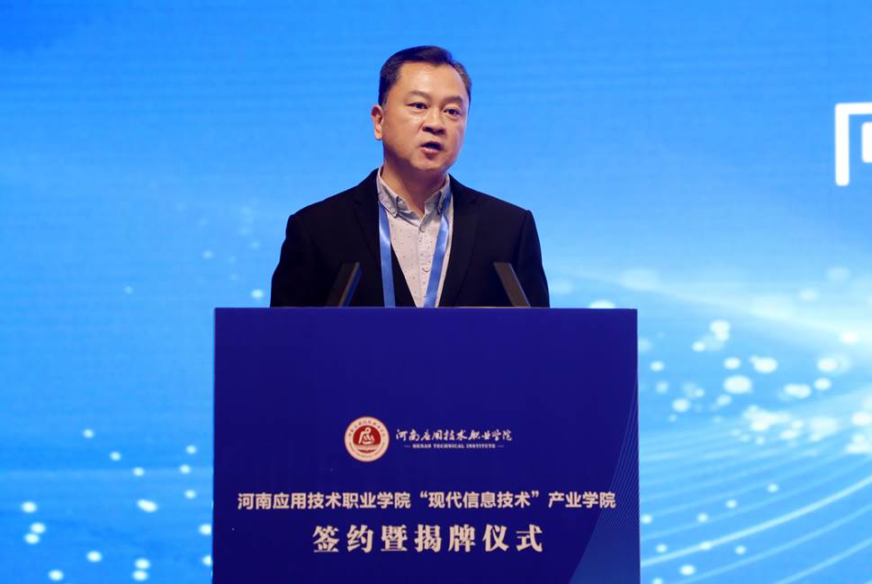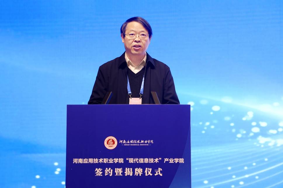 党委书记闫俊山代表学校致辞。他首先对各位来宾表示热烈欢迎,向关心、支持产业学院创建的各界朋友表示衷心的感谢。他强调校企共建“现代信息技术产业学院”,是校企各方相互认可、优势互补、不懈努力的结果,顺应了国家、行业以及学校的发展战略,是时代所需、产业所需、学校所需、学生所需。对于我校推进内涵建设,实现“十四五”目标、争创国家级双高校、举办职业本科教育都具有十分重要的意义,也必将产生深远的影响。他希望“现代信息技术产业学院”成为融学科建设、人才培养、应用研究、创新创业等功能于一体的示范性育人平台和服务地方电子信息产业的主阵地,为锚定“两个确保”、实现“十大战略”,奋力推进中国式现代化建设河南实践作出新的更大贡献!