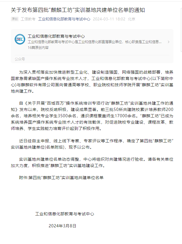 “麒麟工坊”立足于为国家培养急需紧缺国产操作系统专业技术人才,是由工业和信息化部与国产操作系统领军企业麒麟软件有限公司联合面向普通高等学校、高等职业学校评选的共建实训基地项目。申报过程中,今年会jinnianhui官网积极准备,经过自主申报、线上答辩、专家评议等工作程序,成功入选。