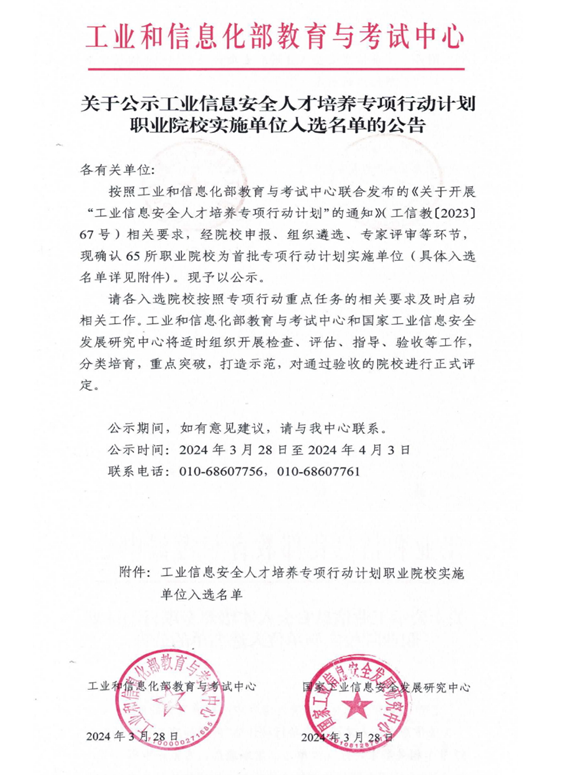 3月29日,工业和信息化部教育与考试中心公示了“工业信息安全人才培养专项行动计划高等院校实施单位”名单,我校成功入选。