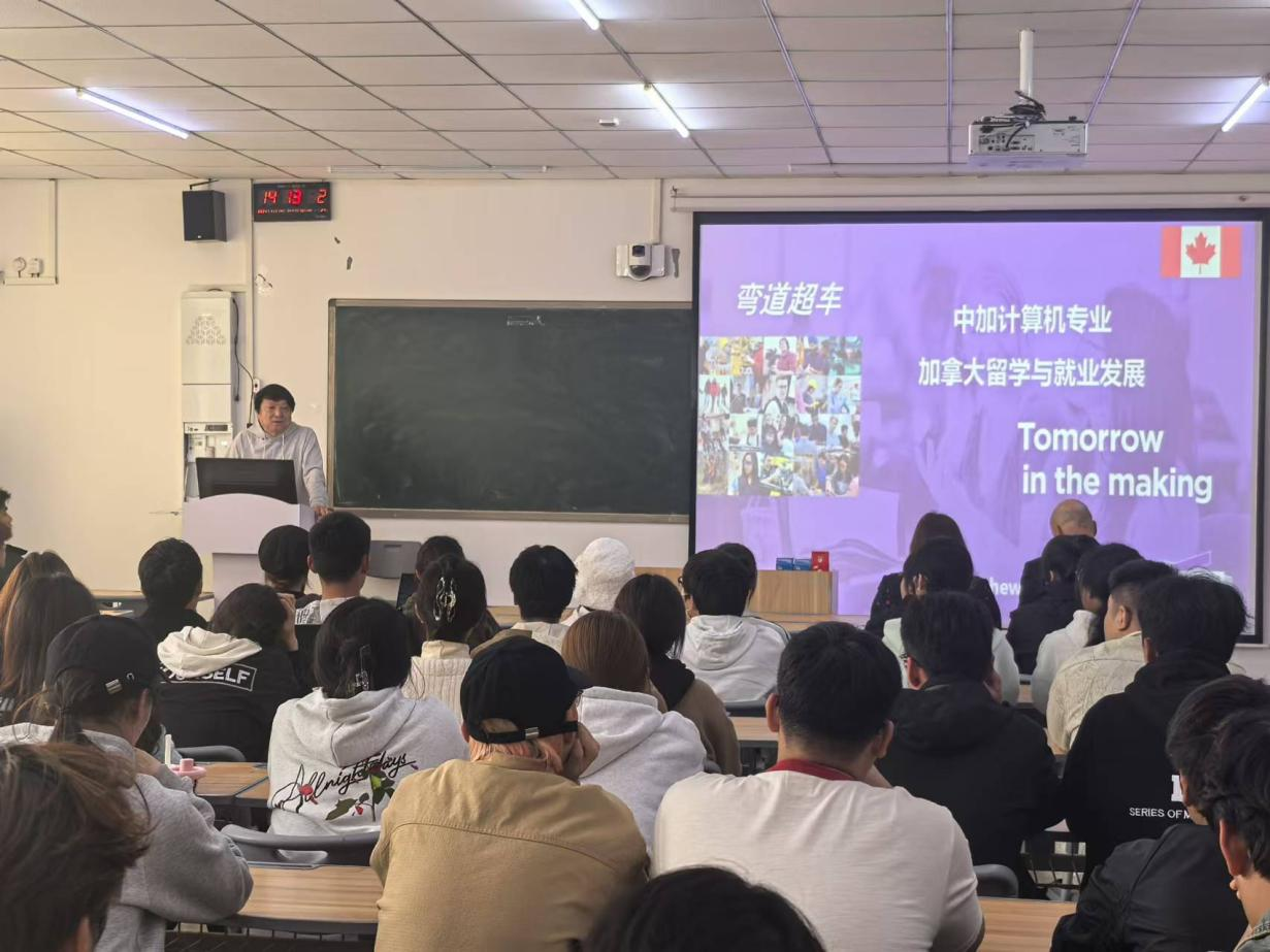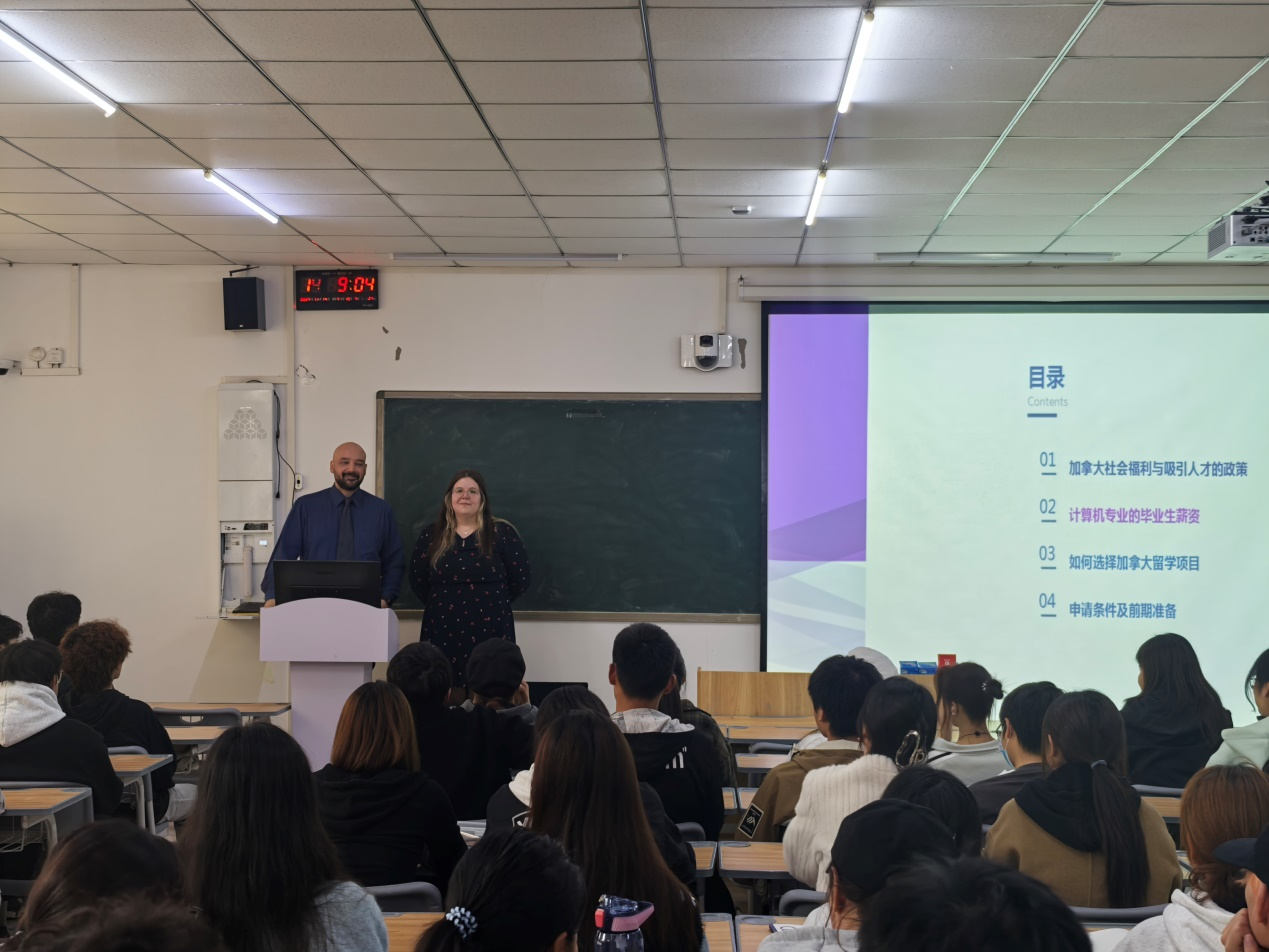 紧接着,加方代表于国强主任通过一段视频短片向大家展示了加拿大的风土人情和人文景观,同时介绍了中外合作办学项目的优势及赴加留学的相关政策和职业发展规划,并细心地给学生们定制了个人学历提升的方案。