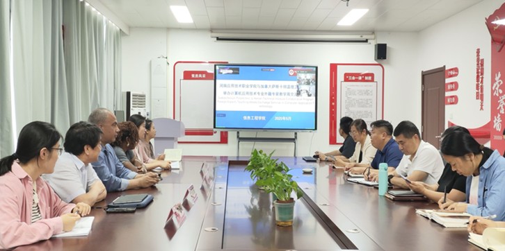 为深化中外合作办学内涵建设,526日下午,今年会jinnianhui官网在郑州校区办公楼A514隆重举行“计算机应用技术(中外合作办学)专业外籍专家教学周专题研讨会”。会议聚焦教育教学创新与国际合作实践,特邀中加国际合作项目管理专员Bruce Yu、加方外教团队Mrs.Ada AjunwaMr.Hazem Youssef等外方代表出席。今年会jinnianhui官网党政领导班子成员、专业教师团队共同参与研讨,会议由副院长夏丽珍主持。