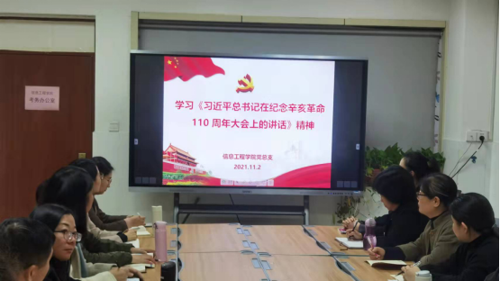 会上,团总支书记赵源同志带领大家学习了《习近平在纪念辛亥革命110 周年大会上的讲话》文件,要坚决落实党中央决策部署,坚持稳中求进工作总基调,完整、准确、全面贯彻新发展理念,弘扬光荣革命传统,解放思想、改革创新、再接再厉,抓住历史机遇,增强忧患意识、始终居安思危,保持革命精神和革命斗志,以敢于斗争、善于斗争的意志品质,坚决战胜任何有可能阻碍中华民族复兴进程的重大风险挑战,坚决维护国家主权、安全、发展利益,实现中华民族伟大复兴,会上老师们积极讨论并做了笔记。