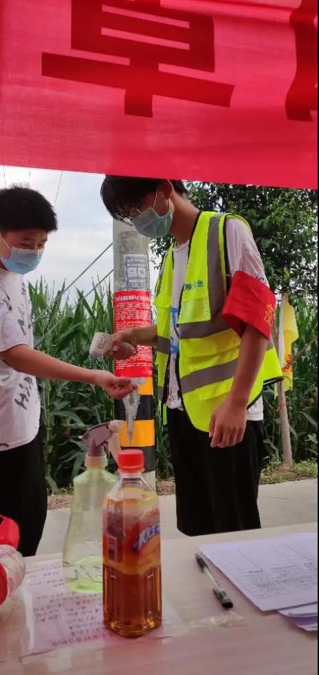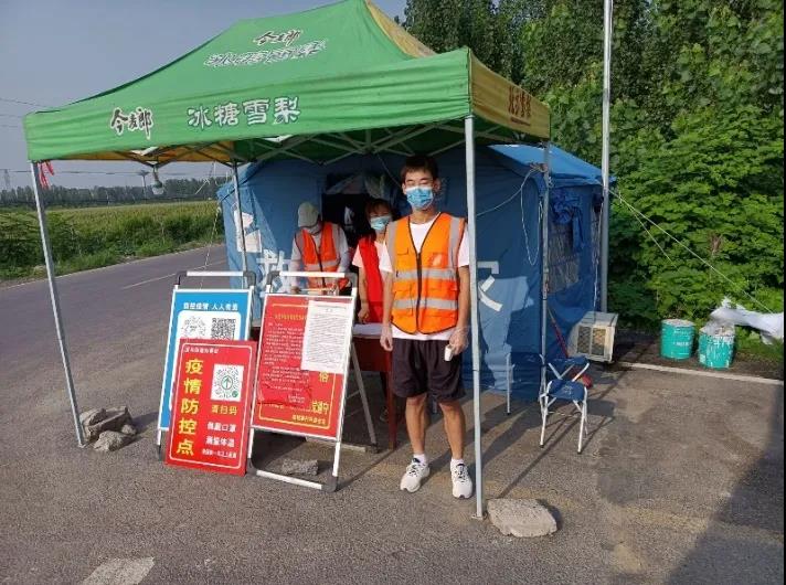 该同学在家乡袁小屯村入口执勤点辅助村社区工作人员,对外地返安人员及进出村人员进行扫行程码和健康码登记、消毒、测量体温,给村民宣传防疫知识,不畏酷暑,用辛勤的汗水守护父老乡亲的健康。