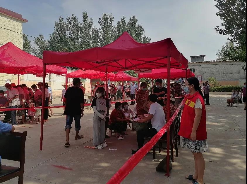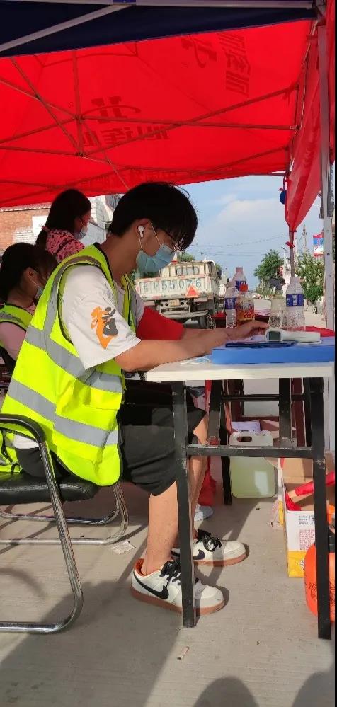 2021年8月9日,在漯河市舞阳县马村乡慕庄村进行的核酸检测中,该同学自愿站岗,帮助工作人员维持秩序,对预约前来核酸检测的群众进行信息登记和测量体温,引导人员进行核酸检测。