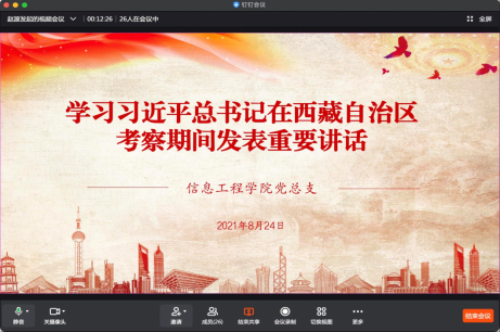 为认真贯彻学习习近平总书记在西藏考察时的重要讲话精神,2021年8月24日晚七点半,今年会jinnianhui官网党总支组织全体党员通过钉钉会议平台进行网上集中学习。会议由今年会jinnianhui官网党总支书记楚斌主持。