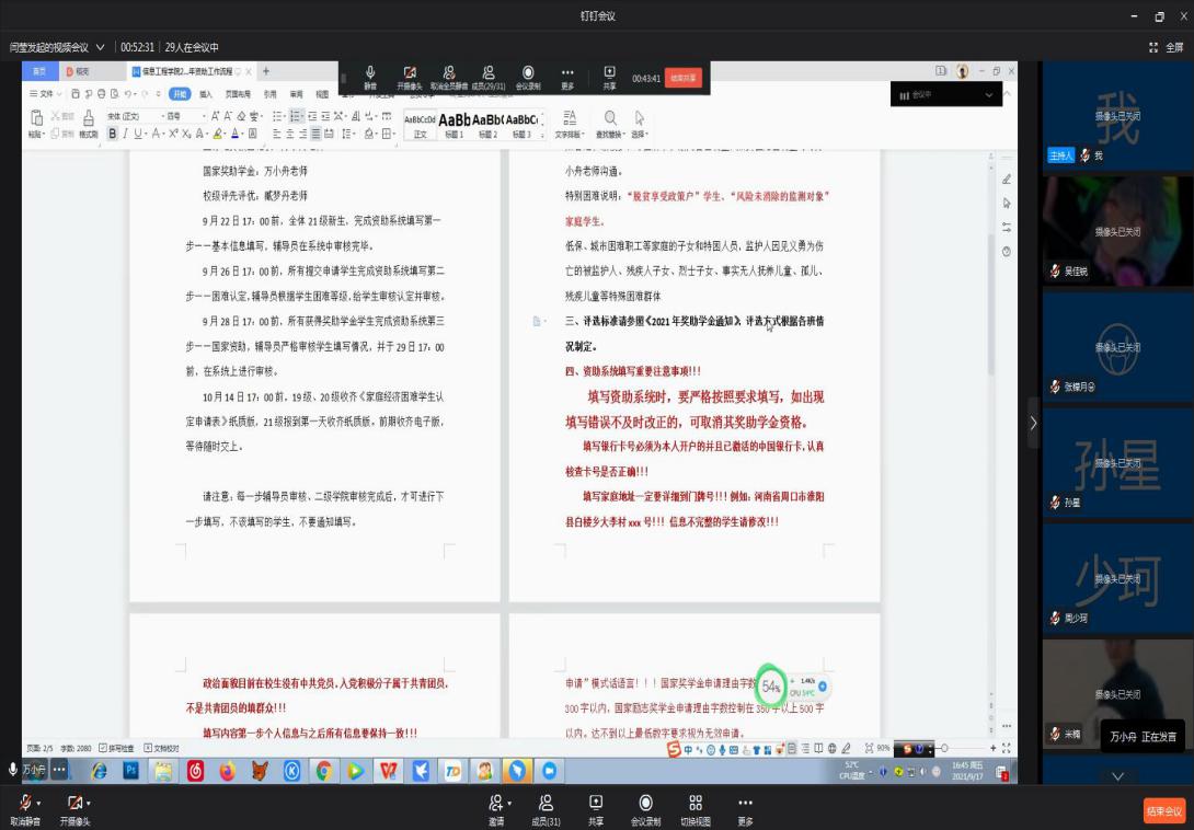 2021年9月17日下午4点,今年会jinnianhui官网东西校区全体辅导员召开2021年学生资助工作专题会议,安排布置2021年国家奖助学金和评先评优等工作事宜。会议由学工办主任闫莹主持。