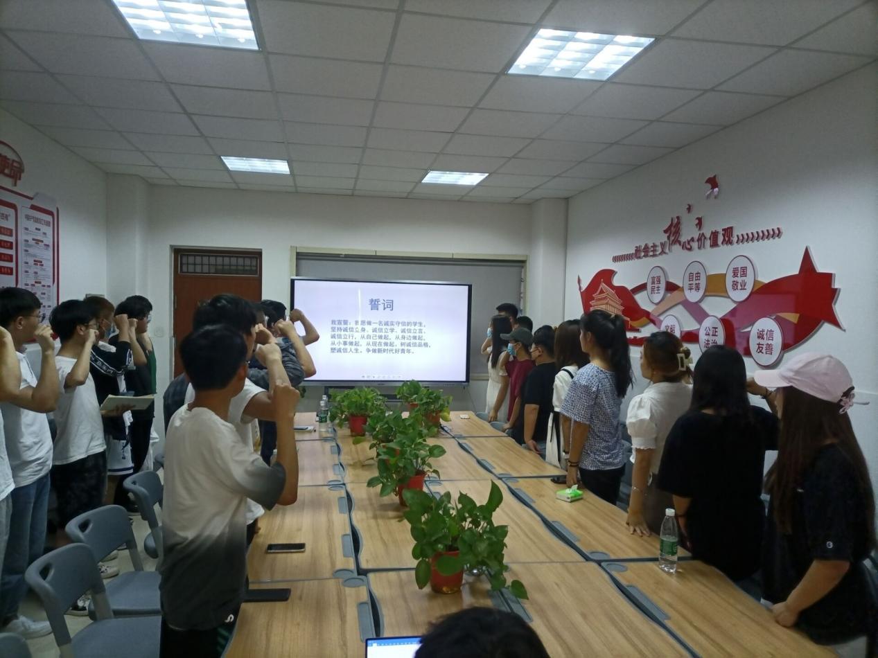 “我郑重承诺,严格遵守国家规定,恪守诚信道德规范……”315教室内宣誓声响彻云霄,在学生代表翟战雨的带领下,同学们共同进行了“诚信还贷”宣誓。誓言铿锵有力,表明了同学们坚定的决心与信念。