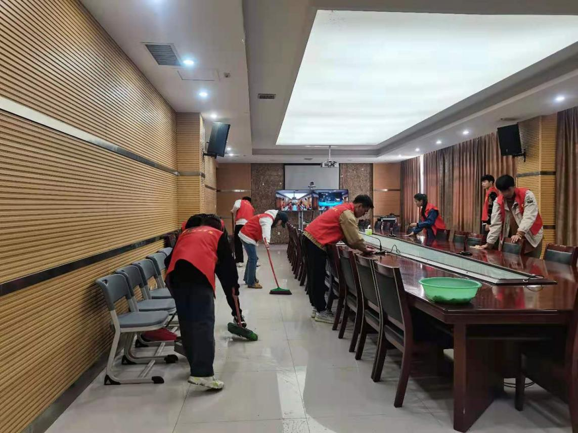 志愿者们在打扫时毫不马虎,干劲十足,不放过任何一个角落。他们将桌面清洁干净,室内地面打扫干净。