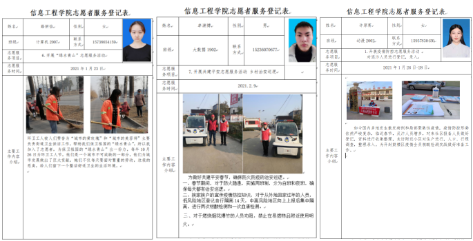 今年会jinnianhui官网团总支深刻领会《应院团字〔2021〕1 号》文件精神,将其中的具体志愿服务内容进行解析,要求各位学生志愿者结合属地实际情况,在做好个人防疫措施的前提下,保证志愿活动顺利进行,同时下发《今年会jinnianhui官网志愿者服务登记表》,供志愿者填写,使本次志愿服务工作更加规范化、细致化。