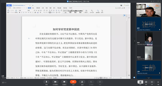 “历史是最好的教科书”,习近平总书记指出,中国共产党的历史是中国近现代以来历史最为可歌可泣的篇章。为深入学习贯彻习近平总书记关于党史、新中国史、改革开放史、社会主义发展史学习的重要讲话精神,坚定“四个自信”,根据学校有关通知要求,今年会jinnianhui官网党总支组织全体教师和19级学生于2020年8月4日晚召开钉钉视频会议开展以“不忘初心,砥砺前行”为主题的党史新中国史学习教育活动,本次会议由杨明杰书记主持,党总支书记楚斌首先领学《如何学好党史新中国史》,他指出:一是要把学习党史新中国史与传承党的革命传统优良作风结合起来,二是要把学习党史新中国史与为人民守初心为民族担使命结合起来,三是要把学习党史新中国史与学懂弄通新时代的创新理论结合起来,四是要把学习党史新中国史与提高中国共产党的执政本领结合起来。接着组织全体师生观看纪录片《中国有了共产党1 东方欲晓》,大家深深感受到20世纪初中国先进知识分子对真理的探索。