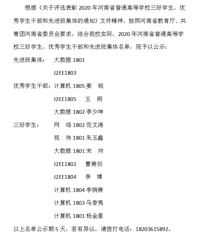 2020年河南省普通高等学校三好学生、优秀学生干部、先进班集体公示