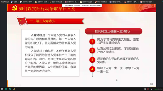 如何以实际行动争取早日入党这一部分,马老师要我们做到以下几点:一要我们加强实践锻炼端正入党动机、二要我们坚定共产主义远大理想、三要我们加强政治理论的学习、四要我们积极参与各项活动、践行为人民服务的宗旨。