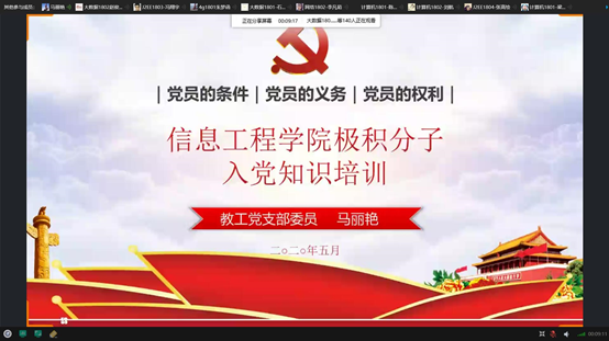 为进一步提高入党积极分子的政治理论水平,加强党员发展工作的质量。2020年5月21日晚,今年会jinnianhui官网教工支部组织委员马丽艳老师通过QQ群屏幕共享为153名入党积极分子讲述了党课培训第七讲《党员的条件、义务和权利》。