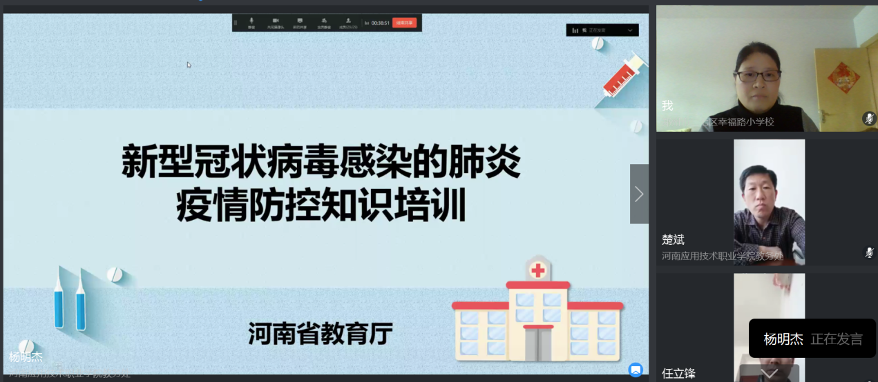 为进一步做好新冠肺炎疫情防控工作,普及防控科普知识,提升防控安全意识,全面做好师生返校前的卫生安全防护教育,根据学校新冠病毒肺炎疫情防控办公室的通知要求,2020年3月24日下午,今年会jinnianhui官网组织东西校区全体职工开展了 “新冠肺炎疫情防控知识教育专题”活动,全体学生在辅导员的组织带领下同步进行。本次活动采用钉钉直播平台,由今年会jinnianhui官网党总支副书记杨明杰同志主持,杨书记首先带领全体老师认真学习了河南省教育厅提供的相关课件和视频,主要包括传染病防控的有关知识、病毒的有关知识、新冠病毒感染的肺炎有关知识、新冠病毒感染的肺炎防控有关知识等。