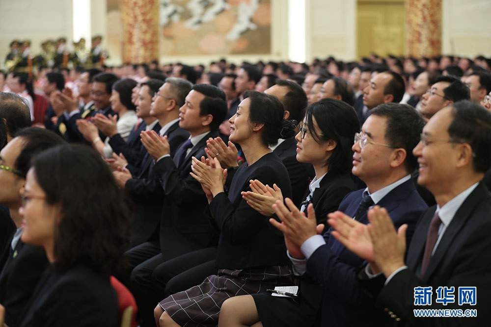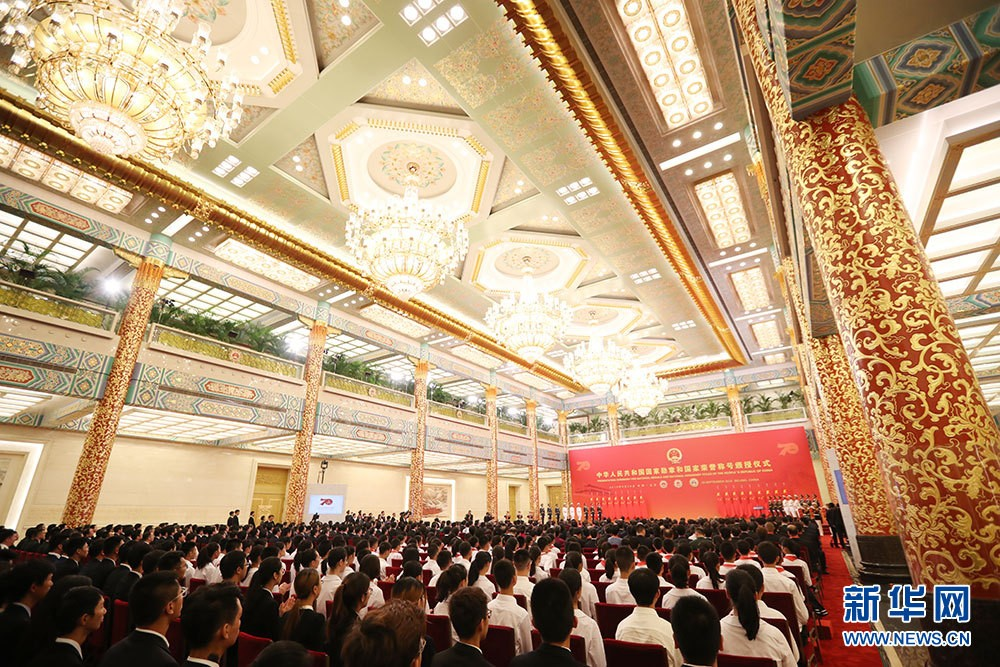 今天,在全国各族人民共同庆祝中华人民共和国成立70周年之际,我们在这里隆重举行仪式,将国家最高荣誉授予为国家建设和发展建立了卓越功勋的杰出人士和为促进中外交流合作作出杰出贡献的国际友人。