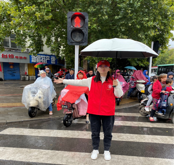 他们身穿红色马甲,冒着大雨,认真引导行人有序停车,劝阻行人不规范停车,协助辅警指挥交通并宣传文明交通常识。
