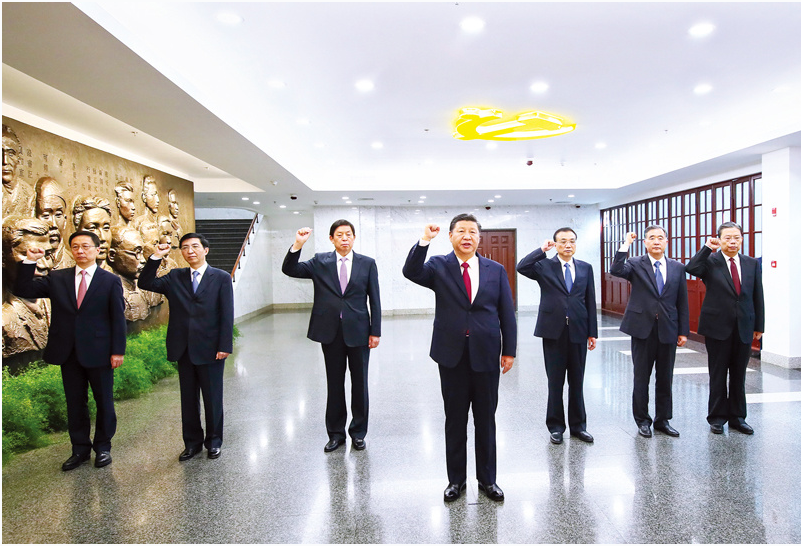 2017年10月31日,中共中央总书记、国家主席、中央军委主席习近平带领中共中央政治局常委李克强、栗战书、汪洋、王沪宁、赵乐际、韩正,瞻仰上海中共一大会址和浙江嘉兴南湖红船。这是31日上午,在上海中共一大会址纪念馆,习近平带领其他中共中央政治局常委同志一起重温入党誓词。 新华社记者 兰红光/摄