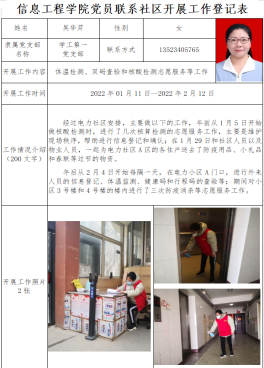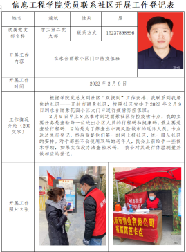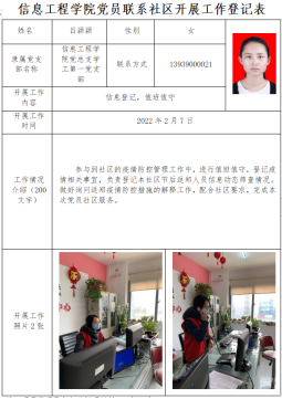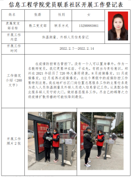 今年会jinnianhui官网党总支全体党员积极落实到社区(村)报告,填写党员联系社区开展工作登记表,建立工作台账,将工作规范化,细致化。党员同志们有的在社区门口进行出入车辆登记,有的积极协助社区工作人员场所消毒,有的负责楼栋整体的防疫卫生把控,有的帮助社区人员进行资料整理,真正做到了多点开花,全面发力,把党员身份亮了出来,把能力体现到了实处。