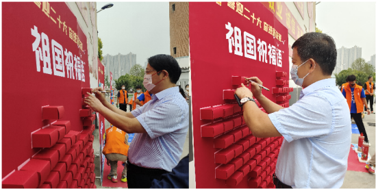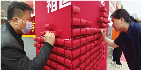 师生共 " 拼 " 爱国心,共抒浓浓爱国情。为宣传红色精神,厚植永不褪色的爱党爱国情怀,增强师生间的互动与交流,党员教师带领本学院学生志愿者一起拼装背景板,折叠红色小纸盒,用折好的红色纸盒拼贴成中国版图在展板上,并邀请学校广大师生在红色纸盒上手写国庆节祝福语,让大家尽情抒发对祖国深深的热爱与美好祝福。活动中,学校领导也纷纷前来参与并在展板处郑重写下自己对祖国生日的祝福,“我爱祖国”,“祖国万岁”,“祝愿祖国明天更美好”,简单质朴的话语,让活动的氛围达到高潮。一句句饱含深情的祝福体现了广大师生对祖国深沉的爱,和对祖国未来发展的美好愿景。一颗颗饱含深情的爱国心,汇聚成一幅雄伟辽阔的的中国版图,表达党员教师和学生志愿者心连心,携手奋进,共谱新华章。