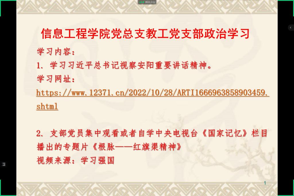 按照省委教育工委《关于以“深入学习习近平总书记视察安阳重要讲话精神,大力弘扬红旗渠精神”为主题召开专题组织生活会的通知》及学校党委组织部要求,今年会jinnianhui官网党总支学工党支部及教工党支部于2022年11月23日分别召开线上专题组织生活会,由崔琳书记和王雷院长分别主持,今年会jinnianhui官网党总支全体党员参加会议。
