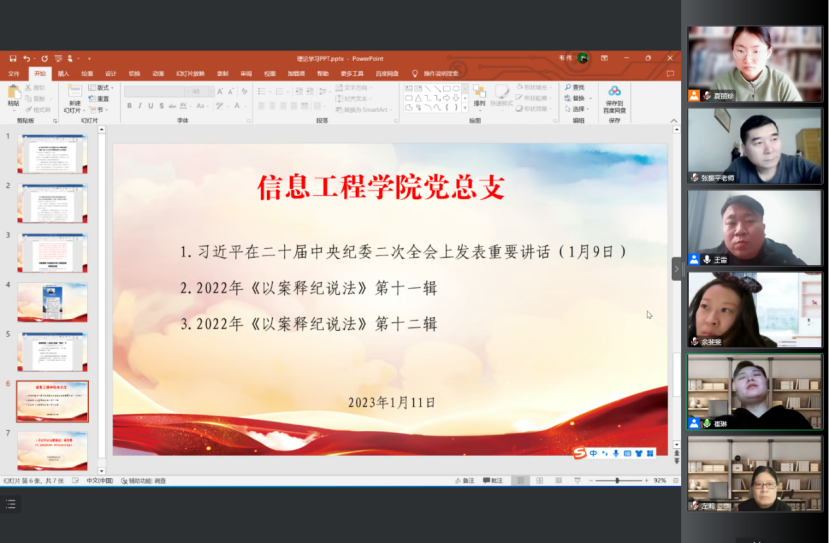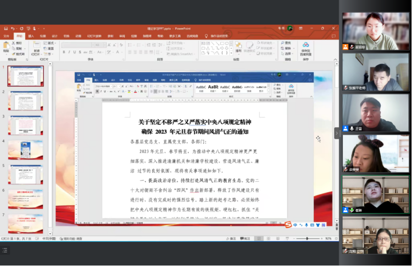 会议第二项,崔琳梳理总结2022年学院党建工作要点及廉政工作落实情况,传达并组织学习学校纪委近期下发的三个重要文件。会议中指出,按照《河南省纪委监委驻省教育厅纪检监察组关于2023年元旦春节期间纠”四风”树新风工作提示》及学校纪委《关于坚定不移严之又严落实中央八项规定精神 确保 2023 年元旦春节期间风清气正的通知》精神,今年会jinnianhui官网党总支在2022年12月29日、31日组织全体教职工进行了相关文件学习,在2023年1月4日、6日分两次学习了违反中央八项规定典型案例、违反教师职业行为典型案例,并在1月5日采用新媒体形式进行了集体廉政提醒谈话。1月11日上午,组织全体教职工学习《习近平在二十届中央纪委二次全会上发表重要讲话》、2022年《以案释法》第十一辑、2022年《以案释法》第十二辑,崔琳书记再次强调元旦春节既是“人情关”,更是“廉洁关”,要求每一位教职工在元旦春节期间牢记校纪委通知精神,纠四风树新风,过一个廉洁祥和文明的假期。