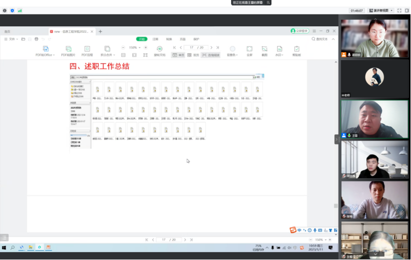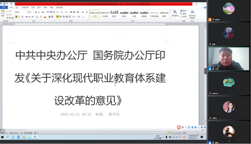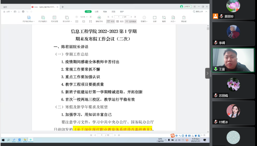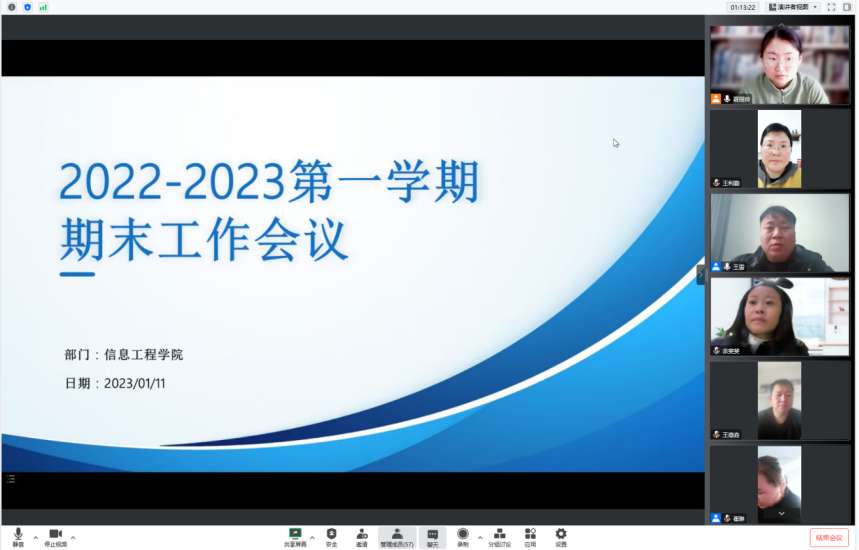 2023年1月11日上午9:30至11:30,今年会jinnianhui官网通过腾讯会议召开了2022学年工作总结及新学年工作部署大会,会议由夏丽珍副院长主持,王雷院长和崔琳书记做整体工作部署,全体专兼职教师参会。