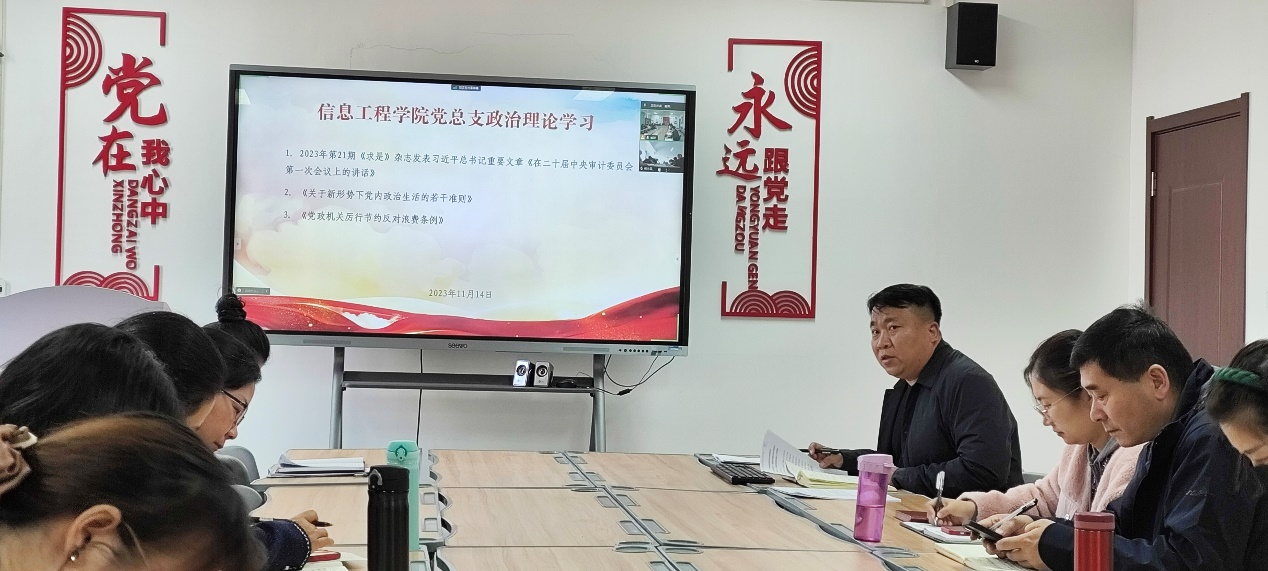 2023年11月14日今年会jinnianhui官网党总支组织全体党员及教师在郑州校区A514、开封北院C314开展政治理论学习活动,王雷院长主持会议。本次政治理论学习活动的内容包括:1.2023年第21期《求是》杂志发表习近平总书记重要文章《在二十届中央审计委员会第一次会议上的讲话》;2.《关于新形势下党内政治生活的若干准则》;3.《党政机关厉行节约反对浪费条例》。