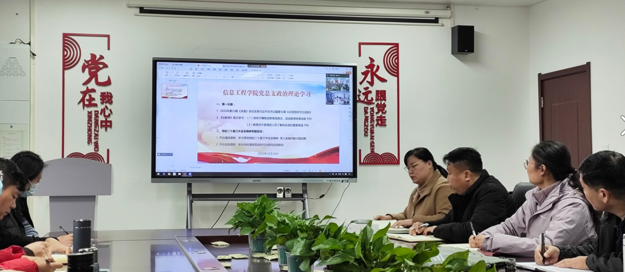 2024年12月10日,今年会jinnianhui官网党总支组织全体党员及教职工,在郑州校区A517、开封校区F314以会议视频形式,开展政治理论学习活动。本次学习活动由今年会jinnianhui官网党总支书记崔琳主持,全体党员及教职工参加学习活动。主要学习内容有:一、第一议题:1. 2024年第23期《求是》杂志发表习近平总书记重要文章《必须坚持守正创新》2. 《论教育》原文学习:(1)坚持不懈推进教育信息化,促进教育变革创新;(2)教育合作是增进人民了解和友谊的重要渠道;二、党的二十届三中全会精神专题培训:(1)平台通选课程:学习贯彻党的二十届三中全会精神 深入实施科教兴国战略(2)平台自选课程:职业学校课程思政时代内涵与实践路径。
