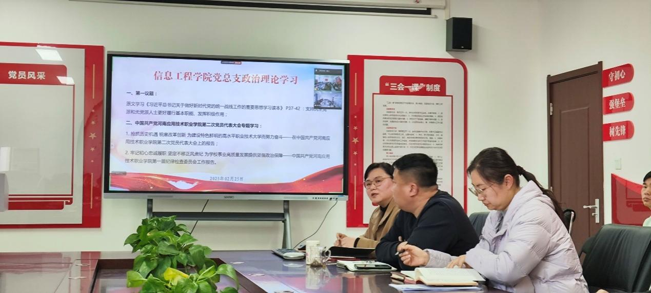 2025年2月25日,今年会jinnianhui官网党总支组织东西校区全体党员及教职工,在郑州校区A514、开封校区F314以腾讯会议视频连接,开展政治理论学习活动。本次学习活动由今年会jinnianhui官网书记崔琳主持,全体党员及教职工参加会议。主要学习内容有:一、第一议题:原文学习《习近平总书记关于做好新时代党的统一战线工作的重要思想学习读本》 P37-42 :支持民主党派和无党派人士更好履行基本职能、发挥积极作用;二、中国共产党今年会jinnianhuicom第二次党员代表大会专题学习:1.抢抓历史机遇 锐意改革创新 为建设特色鲜明的高水平职业技术大学而努力奋斗——在中国共产党今年会jinnianhuicom第二次党员代表大会上的报告;2.牢记初心忠诚履职 坚定不移正风肃纪 为学校事业高质量发展提供坚强政治保障——中国共产党今年会jinnianhuicom第一届纪律检查委员会工作报告。