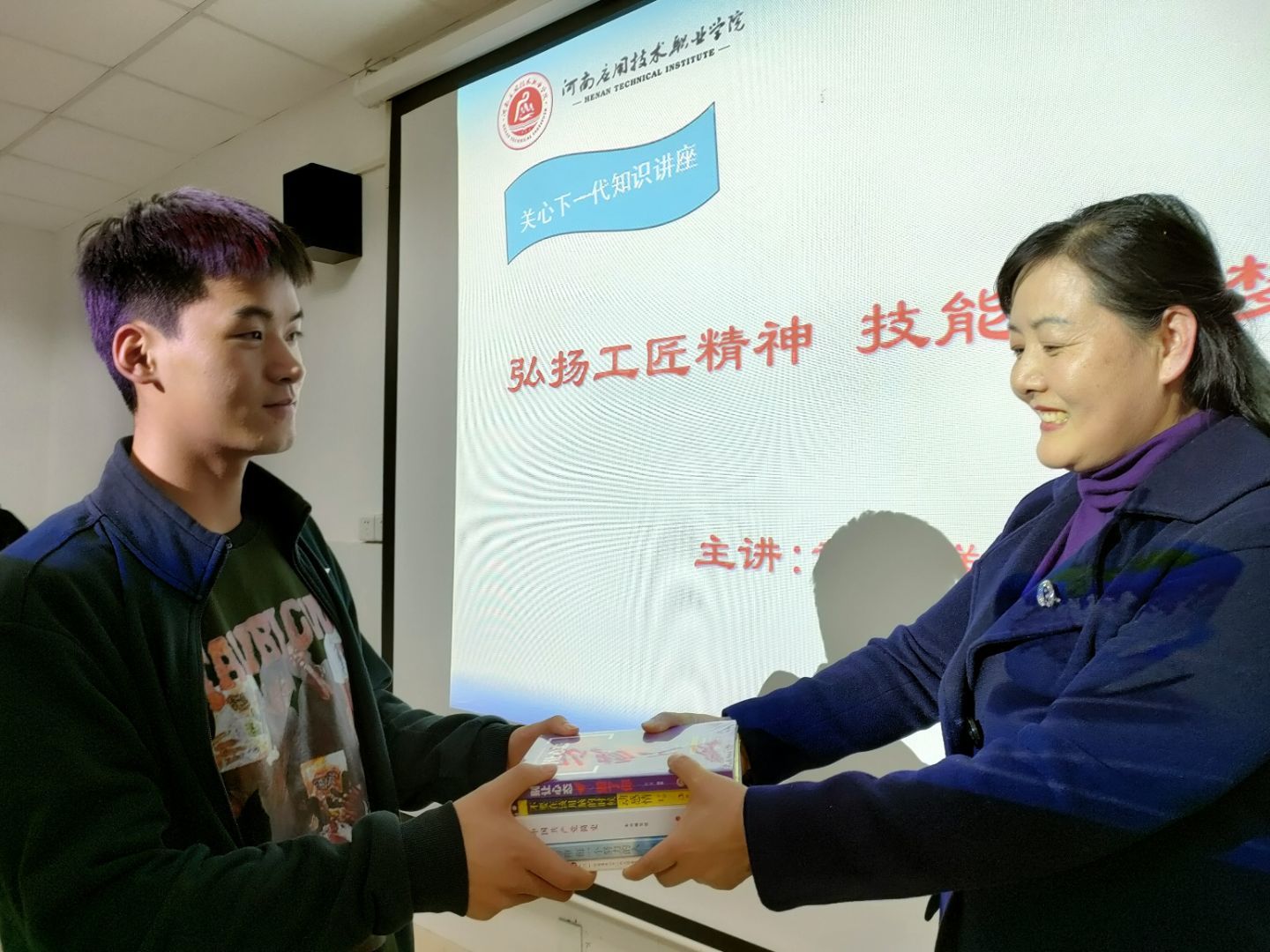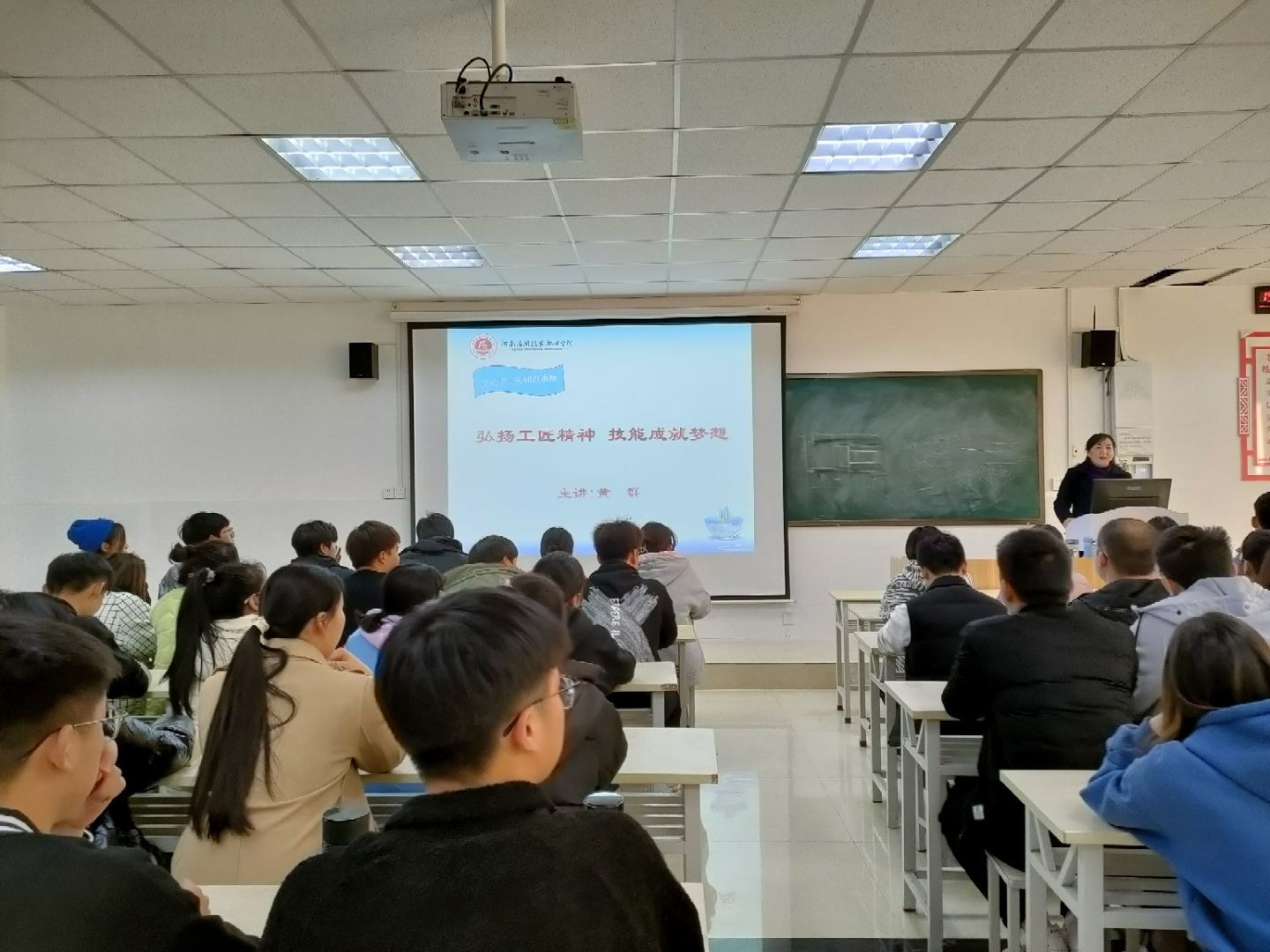活动伊始,首先由赵源老师和徐娟老师为同学们赠予相关书籍,旨在让他们充满梦想与希望,更深入的学习、弘扬“工匠精神”;之后,黄群教授为同学们进行了一场《弘扬工匠精神 技能成就梦想》的知识讲座,主要通过讲述一些我国具有奋斗精神、工匠精神的真实事例让同学们从中获得具有工匠精神的知识与力量,并向同学们介绍了一批批优秀劳动楷模及我校往届优秀毕业生典范,让同学们感受到了榜样的力量,从而更加鞭策自己向大国工匠的目标奋进。在老师慷慨激昂的演讲中同学们也感慨良多,铭记于心,力求在将来的学习、生活和工作中把平凡的事干到极致。