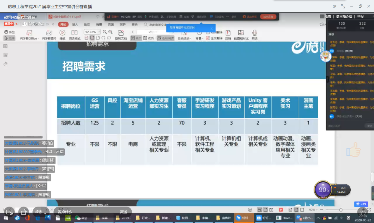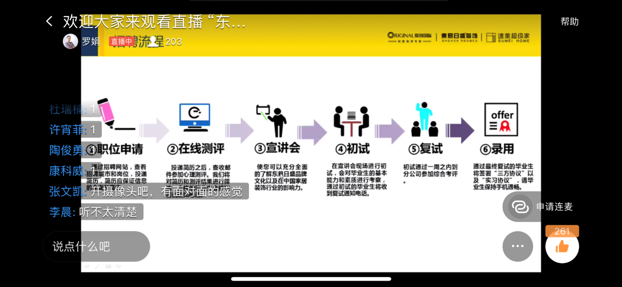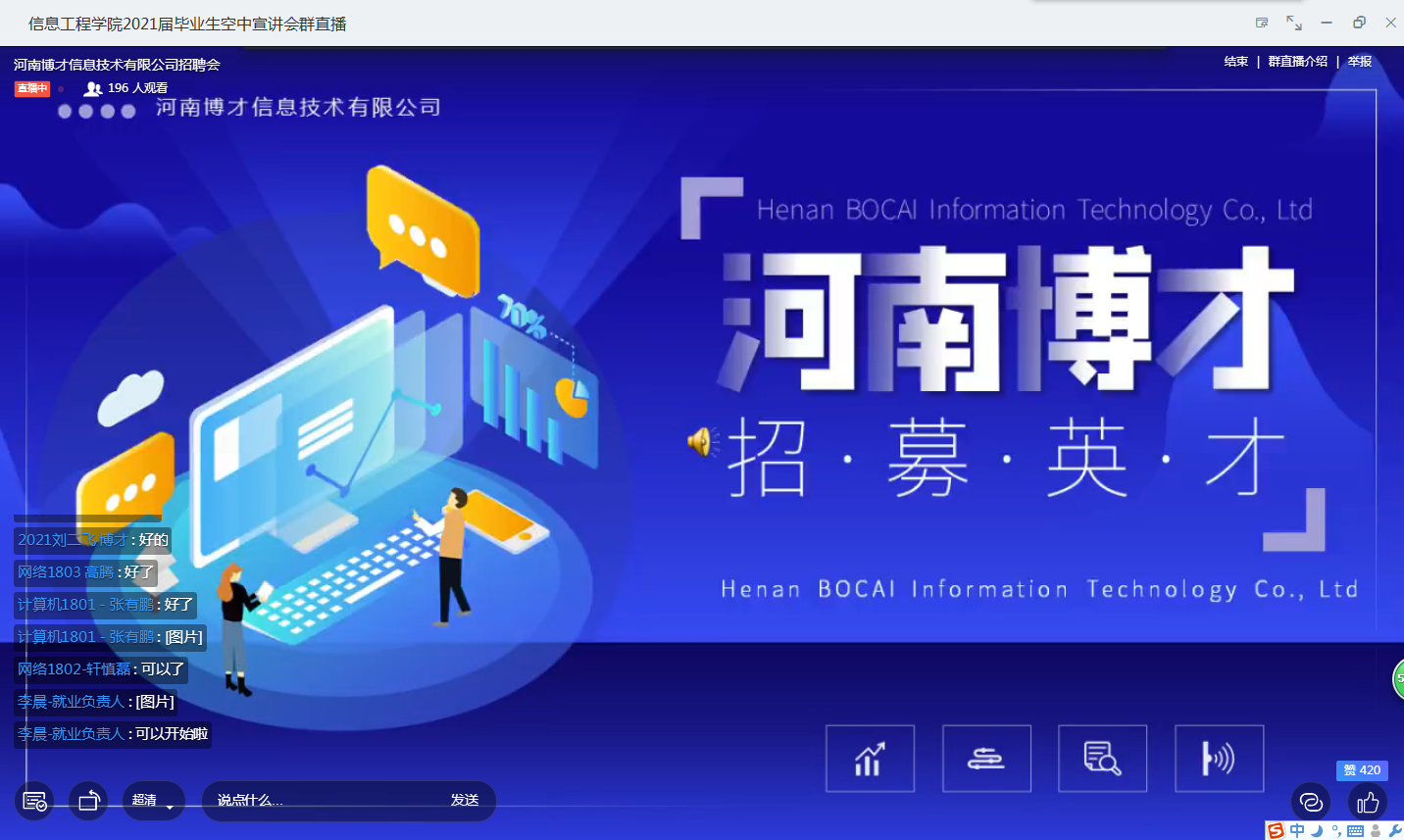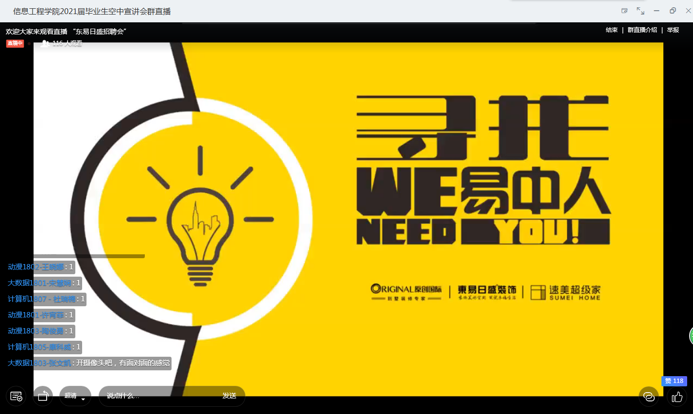 今年会jinnianhui官网”空中宣讲会“开播近一周以来,反响热烈,日平均3场,为同学们疫情下的求职就业提供了有力保障。5月21日、5月22日两天更是每天4场连播,涉及“网络通讯”、“装饰家居”、“教育科技”、“数字产业园”等多个方面。