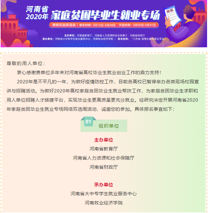 【招聘】5月25-31日河南省2020年家庭贫困毕业生就业专场网络双选周邀请函