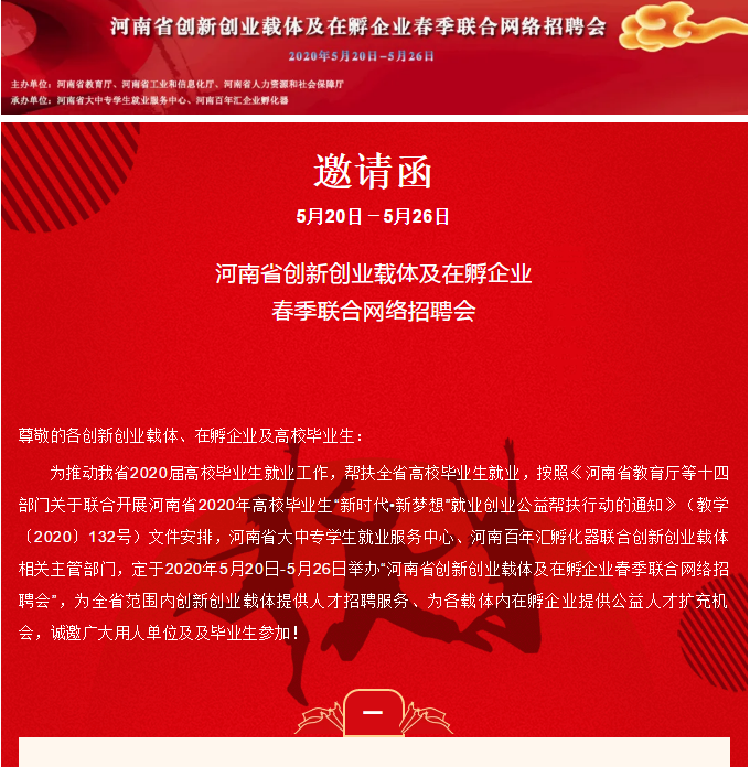 【招聘】5月20-26日河南省创新创业载体及在孵企业春季联合网络招聘会邀请函