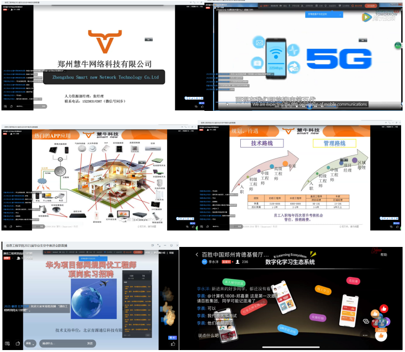 自今年会jinnianhui官网”空中宣讲会“首秀后,同学们求职热情逐渐升温,近两日。我们邀请了4家企业为同学们连续直播,涉及“网络通信”、“电子商务”、“餐饮零售”三个板块。郑州慧牛网络科技有限公司网络商务经理张经理、北京育源通信科技有限公司河南区域负责人姜泽、无线网规网优高级工程师杨鑫兴、浙江智谷电子商务有限公司人事经理刘其超、百胜中国郑州肯德基有限公司招募主管,校企合作项目负责人李永洋应邀为同学们带来内容丰富的空中宣讲会,学院2018级700余名学生通过钉钉直播参与其中。