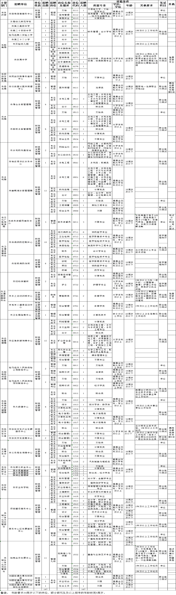 2020年驻马店市市直15个部门所属37个事业单位面向社会公开招聘工作人员147名,其中:市发改委3名、市教育局12名、市民宗局1名、市司法局3名、市水利局25名、市文广旅局3名、市卫健体委23名、市应急局12名、市招商局4名、市大数据局8名、市扶贫办5名、市机关事务中心6名、市住房公积金中心5名、市农科院7名、市城乡一体化示范区管委会30名。招聘岗位详见《2020年驻马店市市直部分部门所属事业单位公开招聘工作人员岗位表》(附件1)。